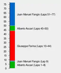 - Car #4: Fangio (first 15 laps) then Fagioli (40 laps). When Fagioli rejoined the race in Fangio's car he was already 20 laps behind.