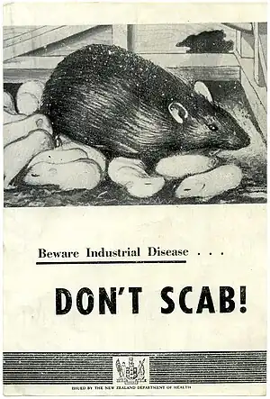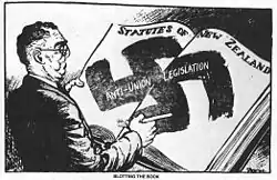 The lockout was a major political issue of the time. The National government, led by Sidney Holland and the Minister of Labour Bill Sullivan, introduced heavy handed emergency regulations,[30] and brought in the navy and army to work the wharves and also deregistered the Waterside Workers' Union under the Industrial Conciliation and Arbitration Act. Under the emergency regulations Holland's government censored the press, made striking illegal and even made it illegal to give money or food to either strikers or their families. The proclamations have been described as "the most illiberal legislation ever enacted in New Zealand".[31]
