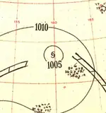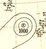 In late April, a well-developed tropical wave began developing east of Chuuk Lagoon.[9] Tracking westward, the easterly wave was analyzed to have organized into a tropical depression by 0000 UTC on April 29.[10] Twelve hours later, Iris was estimated to have strengthened into a tropical storm.[11] At roughly the same time, a vessel in the vicinity of the storm reported winds in excess of 65 km/h (40 mph), prompting the Guam Fleet Weather Center to initiate reconnaissance flights into the cyclone.[7] Midday on April 30, Iris intensified into the equivalent of a modern-day typhoon as it moved in a slightly oscillatory path towards the Philippines.[7][11] After a slight fluctuation in intensity during the overnight hours of May 1, Iris rapidly intensified to reach its peak intensity with a minimum pressure of 909 mbar (909 hPa; 26.8 inHg) and maximum sustained winds of 280 km/h (170 mph) early on May 4,[11] making it the equivalent of a Category 5 super typhoon;[10] at the time this was the first confirmed instance of a typhoon reaching such intensities.[2] Afterwards, Iris weakened slightly before making landfall on South Luzon around 1800 UTC the following day.[11]