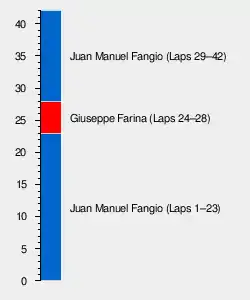 The race took place in the rain, with Fangio initially leading from Farina. Ferrari's Piero Taruffi also challenged for the lead, having started from sixth on the grid. Fangio pitted, handing Nino Farina the lead for the 24th lap of the race. However, Farina's decision not to make a pitstop did not pay off, as Fangio was able to retake the lead on lap 29. Fangio maintained the lead for the remainder of the race, eventually winning by nearly a minute from Taruffi, who had overtaken Farina on the penultimate lap. This was Taruffi's first podium in just his second championship race. The remaining Alfa drivers—Consalvo Sanesi and Toulo de Graffenried—completed the points paying positions, ahead of Ferrari's Alberto Ascari, who competed despite suffering from burns from the previous weekend's Formula 2 race in Genoa. Stirling Moss, driving for HWM, was in seventh, but ran out of fuel on the final lap, therefore yielding the position to Louis Chiron, who was driving a Maserati for Enrico Platé.[1]