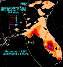 After passing near Cuba, Alice turned to the north and restrengthened to peak winds of 70 mph (110 km/h), possibly even stronger to hurricane intensity. Alice again weakened before making landfall near Panama City Beach on June 6 as a minimal tropical storm, and dissipating shortly thereafter.[3] Alice brought heavy rainfall to Florida, peaking at 13.48 inches (342 mm) in Lake Placid. Near where it made landfall, the storm dropped light rainfall, and there were no reports of damage in the state.[6][3] Alice was the first North Atlantic tropical cyclone to have a female name.[7] It was also one of 22 tropical or subtropical cyclones on record in the month of May.[8]
