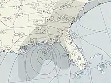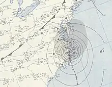 On August 29, a tropical storm developed over southern Florida.[8] While moving through the state, the storm dropped heavy rainfall, reaching 4.67 in (119 mm) at Fort Lauderdale Beach; similar rainfall was observed in the northern Bahamas. Described by one Weather Bureau forecaster as "wide and flat", the storm gradually organized over the western Atlantic Ocean.[20] On August 31, the storm turned to the northwest, with maximum sustained winds of 40 mph (65 km/h). The system weakened to a tropical depression before moving ashore near Savannah, Georgia on September 1. It dissipated that day over land.[8]