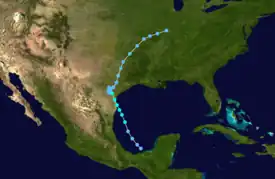 Observations from a reconnaissance flight on June 22 indicated that a large area of showers and thunderstorms in the Gulf of Mexico was producing winds up to 40 mph (64 km/h). Because no circulation was reported, it was operationally classified as a tropical low, though radar stations along the Gulf Coast of Mexico indicated a circulation. Thus, the system became a tropical depression at 0600 UTC on June 22, while located in the Bay of Campeche. The depression strengthened and was estimated to have become a tropical storm on June 23. By early on the following day, the storm peaked with winds of 45 mph (72 km/h). Later that day, it made landfall near Corpus Christi, Texas at the same intensity. The storm weakened slowly and moved across the Central United States, before dissipating over Illinois on June 28.[4][6]