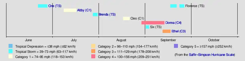 Season activity began on June 23, with the development of an unnamed tropical storm. Tropical cyclogenesis resumed in July with Hurricane Abby between July 10 and July 16, followed by Tropical Storm Brenda from July 28 to July 31. In mid-August, Hurricane Cleo developed and had an uneventful duration. At the end of that month, Hurricane Donna formed and lasted into mid-September; it was the strongest tropical cyclone of the season, peaking as a Category 4 hurricane. There was a Category 3 hurricane in September, Ethel, which briefly existed in the Gulf of Mexico. The last storm of the season, Tropical Storm Florence, dissipated on September 25, over a month before the official end of the season on November 15.[2][4]