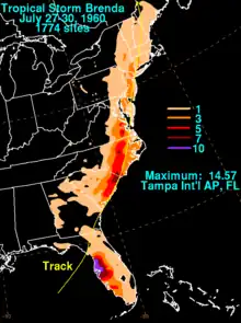 Brenda was considered the worst storm to strike West Central Florida since Hurricane Easy in 1950.[14] It brought wind gusts up to 60 mph (97 km/h) and rainfall amounts reaching 14.57 inches (370 mm) at the Tampa International Airport. While no casualties are directly blamed on the storm, at least one traffic-related death took place.[4] According to an American Red Cross Disaster Service report encompassing eight Florida counties, 11 houses sustained significant damage, while 567 suffered more minor damage. Around 590 families were affected overall. Total monetary damage in Florida is placed at nearly $5 million.[14] Further north, other states reported strong winds and locally heavy rainfall,[15] though no significant damage occurred.[4]