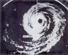 A strong tropical wave produced rainfall and gusty winds in The Bahamas and the Greater Antilles in mid-August. The wave was closely monitored for possible tropical cyclogenesis and special bulletins were issued by the United States Weather Bureau.[16] At 1800 UTC on August 17, Tropical Storm Cleo developed near Cat Island in The Bahamas. The storm headed northeastward and immediately began to intensify.[17] Operationally, the United States Weather Bureau at the hurricane warning center in Miami did not initiate advisories on Cleo until 1500 UTC on August 18. Sustained winds were already 70 mph (110 km/h) at the time, as recorded by a reconnaissance aircraft flight.[18] By 1800 UTC on August 18, Cleo strengthened into a hurricane.[17]