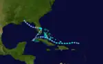 A westward moving tropical wave developed into a tropical depression while located north of Puerto Rico on September 17. By the following day, the depression strengthened into Tropical Storm Florence. Later on September 18, Florence peaked as a 45 mph (72 km/h) tropical storm as it approached The Bahamas. However, unfavorable conditions weakened the storm back to a tropical depression on September 19. On September 21, Florence lost its surface circulation, and the disturbance executed a small cyclonic loop over Cuba. On September 23, the system redeveloped its surface center, and it became a tropical depression again, moving ashore Monroe County, Florida that day. The storm drifted northeastward across the state, re-intensifying into a tropical storm and reaching winds of 60 mph (97 km/h). The storm turned back to the west-northwest and weakened again to a tropical depression. Florence moved across the northeastern Gulf of Mexico, moving ashore again near the Alabama-Florida border on September 26, and dissipating soon after.[4][6]
