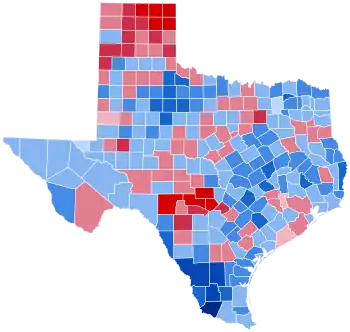 Fears of anti-Catholic voting in West Texas, which had given Herbert Hoover a narrow win over Al Smith in 1928,[3] were not entirely realized. It is notable that the sparsely populated rural Plains counties of Armstrong, Bailey, Childress, Collingsworth, Dallam, Dawson, Donley, Floyd, Gaines, Hale, Hardeman, Hartley, Moore, Motley, Parmer, Wheeler, Willbarger and Yoakum switched from Stevenson to Nixon, as did Wise County north of Fort Worth, while a further thirty-eight counties saw Kennedy fail to reach Stevenson's vote percentage. [4] However, this was more than offset by Kennedy's gains in heavily Hispanic Catholic South Texas, where few Mexicans had voted in 1928.[5] Anti-Catholic voting was also lessened by appeals from former President Harry Truman, who campaigned for Kennedy and Johnson.[6] As of the 2020 presidential election, this is the last time Glasscock County voted for a Democratic presidential candidate.[7]