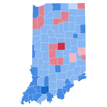 This is the only time since 1852 that Randolph County voted for a Democratic presidential candidate, and this is the only time ever that Wabash County did so.[3] As of the 2020 presidential election, this is the last election in which the following counties voted for a Democratic presidential candidate: Allen, Adams, Bartholomew, Brown, Benton, Carroll, Cass, Clay, Clinton, Daviess, Decatur, DeKalb, Elkhart, Fayette, Fountain, Franklin, Grant, Hancock, Henry, Howard, Huntington, Jackson, Jay, Jennings, LaGrange, Marshall, Miami, Montgomery, Noble, Orange, Parke, Pulaski, Putnam, Ripley, Shelby, Tipton, Warren, Wells, White, and Whitley.[4]