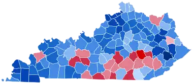 As of the 2020 presidential election, this is the last election in which the following counties voted for a Democratic presidential candidate: Kenton, Boone, Campbell, Oldham, Jessamine, Wayne, Estill, Garrard, and Lee.[7] This is also the sole occasion since 1936 that a Republican presidential nominee has failed to win more than 40% of the vote in Kentucky, and the only occasion since 1876 that the Democrat has won more than 60%. This is also the last time a Democratic presidential candidate won the state by double digits.