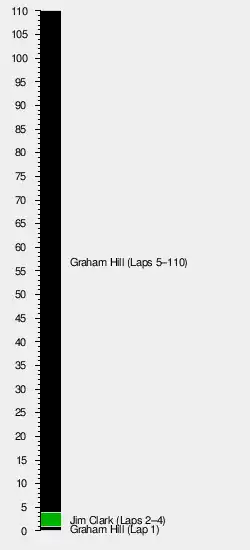 On the second lap, Clark took the lead from Hill, as the two pulled away from Bandini, Spence, Gurney and Brabham. Three laps later, Hill regained the lead, and the two British World Champions dueled until lap 12, when Hill's BRM appeared alone, and Clark coasted into the pits with a broken piston. The group of four following the leaders had been battling hard, as Spence was twice forced off the road by Bandini, and retired on lap six with a broken timing chain. Hill now led Gurney by 14 seconds, followed by Bandini and Brabham.