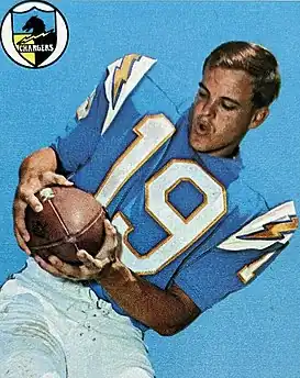 The 1966 AFL Draft took place on November 27, 1965, late in the previous season. The rival National Football League (NFL) conducted its draft on the same day. Where the same player was drafted by both AFL and NFL franchises, the two would compete to sign him.[3] San Diego struggled to sign their highest selections, with their top six (and seven of their first eight) signing for NFL clubs.[4][5] One of these, running back Russ Smith, was cut by the Atlanta Falcons on 6 July, 1966,[6] and joined the Chargers afterwards, spending a year on the taxi squad before scoring 10 touchdowns over the following four seasons.[7][8] 7th-round pick Jim Tolbert stayed with the team for six seasons, and returned briefly at the end of his 11-year NFL career; he played in over 100 games in the Chargers' defensive backfield, starting over 50 of them.[9]