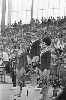 The balance beam and floor medalists: Kuchinskaya, Čáslavská, and Voronina