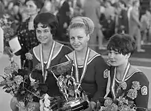 The all-around medalists: Voronina, Čáslavská, and Krajčírová