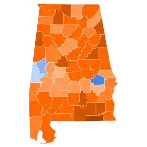 Wallace won his home state in a landslide, receiving 65.86 percent of the vote to Democrat Hubert Humphrey's 18.72 percent, a 47.13 point margin. Republican Richard Nixon, while winning the election nationally, finished a distant third in Alabama with only 13.99 percent, gaining significant support only in a few northern counties with historical Unionist sympathies and higher-income urban areas.[22] Wallace's 65.86 percent of the popular vote would make Alabama not only his best performing state in the 1968 election, but the strongest performing state out of any candidate, with only Humphrey's performance in Washington D.C. being stronger.[23]