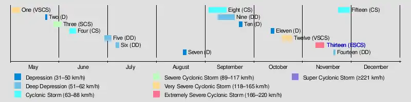 | Thirteen | November 8–13, 1970 | Extremely Severe Cyclonic Storm | 185 km/h (115 mph) | 966 hPa (28.53 inHg) | India, Bangladesh | [2] | ||