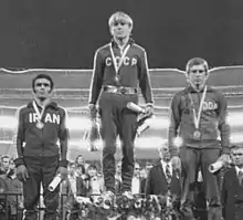 Medal winners of freestyle 57 kg. From left to right, Ramezan Kheder, Vladimir Yumin and Hans-Dieter Brüchert