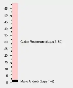 After one lap, Andretti had a four car-length lead over Reutemann and Villeneuve. They were followed by Jones, Lauda, Jarier, Hunt, Watson and Scheckter. Knowing the car had a brake problem, Andretti was hoping he could cope with it, as he had at Monza. Immediately, his lead began to disintegrate. On lap three, Reutemann went by, and on lap four, Villeneuve. As the Ferraris pulled away, Jarier came in on lap 11 from 11th place to change a deflating front tire. After going back out, the car was still bottoming, but once his fuel load lightened, he set the race's fastest lap, which would have qualified him third.