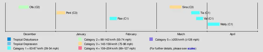 | Ofa | December 9–15 | Category 2 tropical cyclone | Wallis and Futuna | |||||