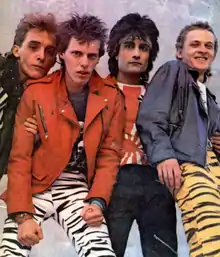 - The Blitz Kids described the movement as a retaliation to punk[108] due to it becoming too violent and unsavory crowds such as neo-Nazis and skinheads deciding to jump on that aesthetic bandwagon.[104] It was also a way to forget their relative poverty following the economic recession and the Winter of Discontent.[108] Features of New Romantic clothing varied from individual to individual, although these generally highlighted the implied individualism, creativity and self-expression of the movement, besides its continued adherence to the DIY ethic of punk.[104] It was inspired by different cultures and time periods, films, film noir, and theatricality. Men often wore dramatic cosmetics and androgynous clothing, including ruffled poet shirts, red or blue hussar jackets with gold braid, silk sashes, tight pants, shiny rayon waistcoats, and tailcoats based on those worn during the Regency era. Women, too, were very theatrical in terms of makeup and style, and often favoured big hair, fishnet gloves, corsets, crushed velvet, and elements of Middle Eastern and gypsy clothing.[105]