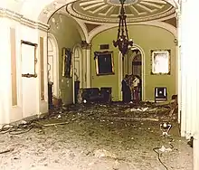 The force of the explosive device, placed beneath a bench at the eastern end of the corridor outside the Chamber, blew off the door to Democratic Leader Robert C. Byrd's office.[7] Senator Byrd was an active supporter of involvement in Grenada, and had recently made attempts to garner support for retaliating against recent attacks against U.S. Marines stationed in Lebanon. The bomb blast also tore a hole in a wall partition, sending pulverized brick and plaster into the Republican cloakroom; the cloakroom's glass windows were shattered.[7] Major damage was done to arches, walls, and the glazed-tile floor near the blast. A grandfather clock that had in been place by the Senate chamber since 1859 was destroyed, and six paintings were ripped, shredded or damaged,[8] including a portrait of Daniel Webster which was badly damaged. Members of the Senate recovered fragments of the painting. A conservator worked for months to restore the painting to a semblance of the original.[3]