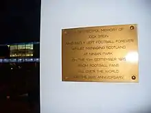 In 2009, the memorial was removed from the stadium when it was demolished and transferred to the "Ninian Park Gates" at the new Cardiff City Stadium.[62] In 2010, to mark the 25th anniversary, the original plaque was removed and taken to the Celtic museum at Parkhead in Glasgow, and was replaced at the Cardiff City Stadium by a replica bearing the same inscription.[60]