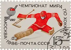 ![]() A Soviet stamp dedicated to the 1986 World Ice Hockey Championships | |