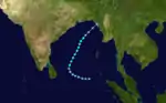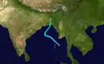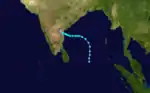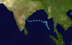 A monsoon depression became more tropical on October 14 in the Bay of Bengal. It traveled northwestward, becoming a tropical storm on the 15th and hitting southeastern India as a 50 mph storm that night. It rapidly dissipated over land.