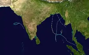 The 1988 North Indian Ocean cyclone season was part of the annual cycle of tropical cyclone formation. The season has no official bounds but cyclones tend to form between April and December. These dates conventionally delimit the period of each year when most tropical cyclones form in the northern Indian Ocean. There are two main seas in the North Indian Ocean—the Bay of Bengal to the east of the Indian subcontinent and the Arabian Sea to the west of India. The official Regional Specialized Meteorological Centre in this basin is the India Meteorological Department (IMD), while the Joint Typhoon Warning Center (JTWC) releases unofficial advisories. An average of five tropical cyclones form in the North Indian Ocean every season with peaks in May and November.[1] Cyclones occurring between the meridians 45°E and 100°E are included in the season by the IMD.[2]