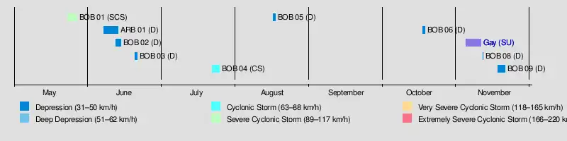 Throughout the season, the IMD monitored ten depressions, three of which became cyclonic storms.[5] The strongest storm of the year was Super Cyclonic Storm Gay. Crossing the Malay Peninsula into the Bay of Bengal on November 4, Gay became one of the most powerful systems on record in the basin, attaining an estimated pressure of 930 mbar (hPa; 27.46 inHg). Collectively, the storms were responsible for at least 1,785 fatalities, 1,445 of which were due to the disastrous flooding triggered by the July Cyclonic Storm, and more than $25 million in damage.