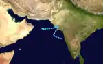 On June 7, small area of low pressure developed off the west coast of India. Over the following two days, convection associated with the low gradually organized and by June 9, satellite intensity estimates from the JTWC reached 55 km/h (35 mph). A TCFA was subsequently issued for the system before it made landfall in Gujarat early on June 10. Although overland, the low maintained significant convection as it turned westward and through its re-emergence into the Arabian Sea on June 11. Once back over water, convection rapidly spread westward in response to an anticyclone over the Arabian Peninsula and Afghanistan. Early on June 12, the cyclone was estimated to have attained tropical storm status based on a ship report near the center of 65 km/h (40 mph) sustained winds and a surface pressure of 998 mbar (hPa; 29.47 inHg). Later that day, strong wind shear stemming from the anticyclone displaced convection from the tropical storm by more than 110 km (70 mi), prompting the final advisory from the JTWC. The remnants of the system were last noted on June 13, dissipating over the Arabian Sea.[15]