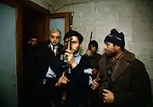 The lack of organization within governmental troops and the defection of a large amount of forces during the coup makes any attempt to estimate the size of troops loyal to Zviad Gamsakhurdia difficult.[lower-alpha 2] At the onset of the conflict, the National Guard, which includes merely a fraction of its 15,000 original soldiers following Tengiz Kitovani's secession, contributes to the majority of troops protecting the Parliament building, but the number of actual National Guard members participating in the conflict remains unknown, as a large part of the Guard remains in South Ossetia during the coup.[21] While some western sources claim between 1,000 and 2,000 combatants fight for Gamsakhurdia,[37] the latter estimates himself having 5,000 soldiers on his side.[38]
