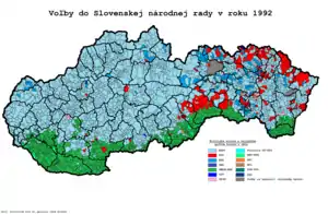Parliamentary elections were held in Slovakia on 5 and 6 June 1992 alongside federal elections. The Movement for a Democratic Slovakia emerged as the largest party, winning 74 of the 150 seats in the National Council and forming a minority government under Vladimír Mečiar. The threshold had been raised from 3% (for the Slovak parliamentary election in 1990) to 5%.