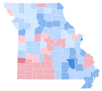 As of the 2020 presidential election, this remains the last time that Dallas County, Howell County, Harrison County, Adair County, Andrew County, Johnson County, Butler County, Atchison County, Phelps County, Platte County, Maries County, Stoddard County, Pulaski County, Dent County, Texas County, and Carter County have voted for a Democratic presidential candidate.[4] It was also the last time that a Democrat carried the state by double digits, the last double-digit win for any candidate until 2016, the last time that Missouri has voted to the left of neighboring Iowa, and the last time that the state voted more Democratic than the nation as a whole, weighing in at about 4 points more Democratic.