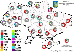 Parliamentary elections were held in Ukraine on 27 March 1994, with a second round between 2 and 10 April.[1] 15 political parties gained seats and the majority of deputies were independents.[2] However, 112 seats were remained unfilled, and a succession of by-elections were required in July, August, November and December 1994 and more in December 1995 and April 1996.[1] Three hundred (300) seats or two thirds (2/3) of the parliament were required to be filled for the next convocation.
