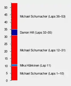 The two Jordan cars collided on lap 15. Rubens Barrichello spun in the final chicane when he attempted to brake later than his teammate Irvine. Barrichello hit a wall, which damaged his car's rear wing and caused him to retire from the race. Irvine was involved in another collision at the chicane on lap 20 when Frentzen hit him from behind. Irvine continued without damage, but Frentzen had to pit for a new front wing.[27] At the front, Alesi was lapping faster than Schumacher, even though Schumacher was on dry tyres.[25] Alesi was only six seconds behind Schumacher when his Ferrari 412T2 suffered an apparent differential failure on lap 25.[6][18] It was later discovered that the problem was a driveshaft failure, possibly as a result of his earlier spin.[27] Schumacher made a pit stop for a second time on lap 31, returning to the race in second place behind Hill. Schumacher set the fastest lap of the race on lap 33, and regained his lead on the next lap when Hill made his pit stop.[25] Behind them, Häkkinen and Coulthard were third and fourth respectively before their pit stops, but Coulthard pitted six laps later than Häkkinen and returned to the track in third place, one place ahead of the Finn.[28] Johnny Herbert was fifth in the second Benetton car after the second round of pit stops, with Irvine rounding out the point-scoring places in sixth.[1][29]