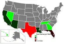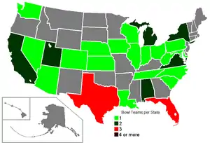 ![]() Number of bowl games per state. | |||||||||||||||||||||||||||||||||||||||||||||||||||||
