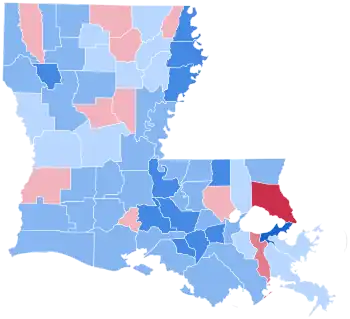 As of the 2020 presidential election, this is the last time Louisiana supported a Democratic presidential candidate, as well as the last time a Democrat carried the following parishes: Acadia, Allen, Ascension, Avoyelles, Calcasieu, Caldwell, Cameron, Catahoula, Claiborne, Concordia, DeSoto, East Feliciana, Evangeline, Franklin, Iberia, Jackson, Jefferson Davis, Lafourche, Lincoln, Morehouse, Natchitoches, Plaquemines, Rapides, Red River, Richland, Sabine, Saint Bernard, Saint Charles, Saint Martin, Saint Mary, Tangipahoa, Terrebonne, Vermilion, Vernon, Washington, Webster, West Feliciana, and Winn.