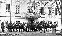 On February 5, Poland signed an agreement with Germany regulating the withdrawal of the German army from western Belarus and giving the Polish army the opportunity to march eastward. On February 14, 1919, Polish troops came into contact with the Bolshevik army near Vawkavysk.[12] The Belarusian authorities, informed by the Germans of the agreement, began to leave Grodno in March 1919. Lithuanian authorities proposed moving the army to Sejny and Suwalki, which the Belarusians rejected. They obtained a loan of 4 million marks from the Ukrainian People's Republic, which gave them some independence.[13] It is possible that at that time the regiment ceased to be maintained from the Lithuanian budget and began to be maintained from Belarusian funds.[14] In early April, German troops began evacuating Grodno. Col. Demidov pulled the 5th company from Kaunas to reinforce his position.[15] On April 16, 1919, the Polish Army launched a wide-ranging offensive against the Bolsheviks from Lida to Vilnius, and entered Grodno.[16] Gen. Wojciech Falewicz took over the command of the Grodno Fortress.[15]