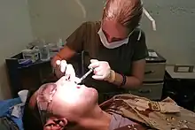 A U.S Navy Hospital Corpsmen assigned the 1st Dental Battalion applying anesthesia to a soldier's mouth.