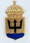 The coat of arms of the 1st Submarine Division (Första ubåtsavdelningen) 1994–1998 and the 1st Submarine Flotilla since 1998. Blazon: "Or, from a wavy base azure a trident issuant sable".[7]