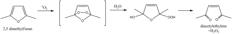 2,5-Dimethylfuran serves as a scavenger for singlet oxygen, a property which has been exploited for the determination of singlet oxygen in natural waters. The mechanism involves a Diels-Alder reaction followed by hydrolysis, ultimately leading to diacetylethylene and hydrogen peroxide as products. More recently, furfuryl alcohol has been used for the same purpose.[9]