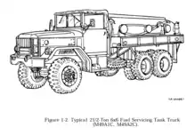 All series had fuel and/or water tank versions on long wheelbases. Capacities were 750 US gal (2,800 L) to 1,200 US gal (4,500 L) in 2 or 3 compartments, depending on the series and whether carrying gasoline, water, or other liquid. Most had pumps and some had heaters. Most World War II units could be fitted with bows and a tarpaulin to camouflage themselves as common cargo trucks.[34][35][48]