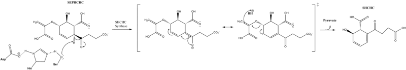 The active site contains a catalytic triad of syrine, histine and arginine, which is conserved across all mutants and is proposed to initiate the reaction.[1] The triad residues are located at Ser86, Asp210, and His232.[5] This triad is proposed to catalyze a proton extraction which triggers a transfer of electrons leading to the elimination of pyruvate and formation of SHCHC.[6] Originally, it was proposed that the transition state was stabilized by a nontraditional oxyanion hole. Now a traditional oxyanion hole is favored, but not definitive.[5]