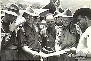 Disembarking in Cairns, Queensland, the battalion subsequently made camp at Ravenshoe, Queensland. Following a period of rest, training and re-organisation, in July 1943 the battalion received a batch of reinforcements from the 5th Motor Regiment, which had been disbanded. A small batch of reinforcements also came from 2/40th Battalion personnel who had evaded capture in Timor.[26] In August 1943, the 2/12th were sent to Port Moresby, where the 18th Brigade was being held in divisional reserve,[27] while the rest of the 7th Division defended the approaches to Lae as part of the Finisterre Range campaign.[28] On the last day of the year,[2] the battalion was committed to the fighting in Finisterre Mountains. They were subsequently joined by the rest of the brigade on 4 January 1944 when it was airlifted to Dumpu to relieve the 21st Brigade.[29] Throughout early 1944, the 2/12th was involved in the fighting around Shaggy Ridge, where they undertook several attacks to the north of the ridge, around the Protheroe I and II features between 21 and 24 January.[2] Between February and April, they continued operations in the Ramu Valley, undertaking patrols before returning to Australia aboard the transport Pahud in May 1944.[30][31]