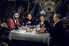 Disneyland used the original sets as a walk-through attraction from 1955 to 1966. Walt Disney World Resort's Magic Kingdom also had a dark ride named 20,000 Leagues Under the Sea: Submarine Voyage from 1971 to 1994 which consisted of a submarine ride, complete with the giant squid attack, and an arrangement of the main theme from the 1954 film playing on Captain Nemo's organ in the background. For this ride, voice artist Peter Renaday stood in for James Mason in the role of Captain Nemo.[35] In 1994, a walkthrough attraction at Disneyland Paris, named Les Mystères du Nautilus, opened,[36] and a dark ride at Tokyo DisneySea was created in 2001.[37] The exterior to The Little Mermaid: Ariel's Undersea Adventure contains a silhouette of the Nautilus in a rock wall[38] and the tiki bar Trader Sam's Grog Grotto at Disney's Polynesian Village Resort serves a cocktail called the "Nautilus"[39] which is itself served in a stylized drinking vessel resembling the submarine,[40] and features a dive helmet and a mechanical squid tentacle that pours liquor behind the bar.[41]