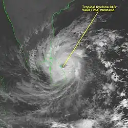 An area of atmospheric convection developed and persisted on December 21 in the central Bay of Bengal[2] forming within an active near-equatorial trough.[3] Located within an area of weak vertical wind shear, the system steadily organized, and after initially remaining nearly stationary it began to move slowly westward. Deep convection continued to develop, and on December 23 a mid-level circulation began to form. Later that day, the Joint Typhoon Warning Center (JTWC) issued a Tropical Cyclone Formation Alert. By the night of the December 23, a low-level circulation developed in the system, located to the south of the deep convection. The disturbance continued to organize,[2] with the India Meteorological Department (IMD) classifying it as a deep depression early on December 24.[3] Later that day, the organization of the system degraded slightly, though it quickly reorganized. On December 25, the Joint Typhoon Warning Center initiated advisories on Tropical Cyclone 04B while it was located about 155 miles (249 km) east of Sri Lanka. On the center's first advisory, the tropical storm was drifting west-northwest at 3 mph (4.8 km/h) with maximum sustained winds of 45 mph (72 km/h).[2] Shortly thereafter, the IMD upgraded the deep depression to a cyclonic storm as a central dense overcast developed over the center.[3]