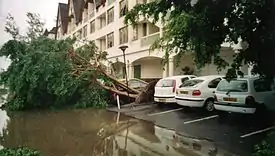 Across Mauritius and Réunion, torrential rains and destructive winds from the cyclone resulted in extensive to "catastrophic" damage.[5] The entire island of Mauritius lost power during the storm and widespread structural damage took place.[13] Agricultural and property damage amounted to US$47 million and US$50 million respectively in the republic.[14][15] Nine fatalities were attributed to the storm in Mauritius: five off the coast of Rodrigues Island and four on the main island. More extensive damage was seen on Réunion where up to 2,102 mm (82.8 in) of rain fell over three days.[5] Flooding destroyed many homes, washed out roads, and caused catastrophic agricultural damage.[16][17] Destructive winds, measured at up to 280 km/h (170 mph), also crippled communications.[5] In all, six people died on the island and losses were estimated at €200 million (US$190 million).[15][18]