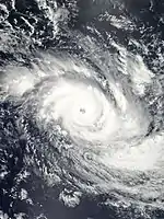 Late on February 16, Guillame began developing a small eye,[5] turning to the east around the same time.[20] With favorable conditions, including good outflow, the system quickly intensified into a compact tropical cyclone as it turned to the southeast. Strengthening briefly stopped on February 17, possible due to an eyewall replacement cycle, although it resumed the following day.[5] Guillame curved to the south and southwest,[20] reaching peak winds of 195 km/h (121 mph) late on February 18;[21] this made it an intense tropical cyclone. The next day, the cyclone passed about 150 km (93 mi) east of Mauritius before an approaching trough turned it to the southeast.[20] Despite the storm's proximity to the island, effects there were modest, marked by winds of 78 km/h (48 mph) and 71 mm (2.8 in) of rain. The cyclone began weakening due to increased wind shear,[5] and deteriorated below tropical cyclone status on February 21. A strengthening ridge turned Guillame toward the northwest, and the storm dissipated on February 23.[5]