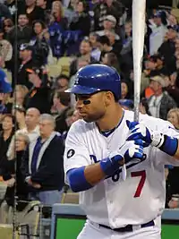 The 2002 Los Angeles Dodgers season was the 113rd for the franchise in Major League Baseball, and their 45th season in Los Angeles, California. The season saw Dan Evans take over as General Manager and in his first season the team won 92 games and was not eliminated from post season contention until the next-to-last day of the season, finishing third overall in the West Division of the National League. Shawn Green hit 42 home runs to become the first Dodger to have back-to-back 40 or more homer seasons. He had four homers in one game on May 23 against the Milwaukee Brewers. He went 6-for-6 in that game and set a Major League mark for total bases with 19.[1] The number broke the previous record of 18 total bases set by Joe Adcock. Éric Gagné, a former starter, was turned into the closer and proceeded to set a club record for saves with 52. This is also their first season to be broadcast on KCOP (13).